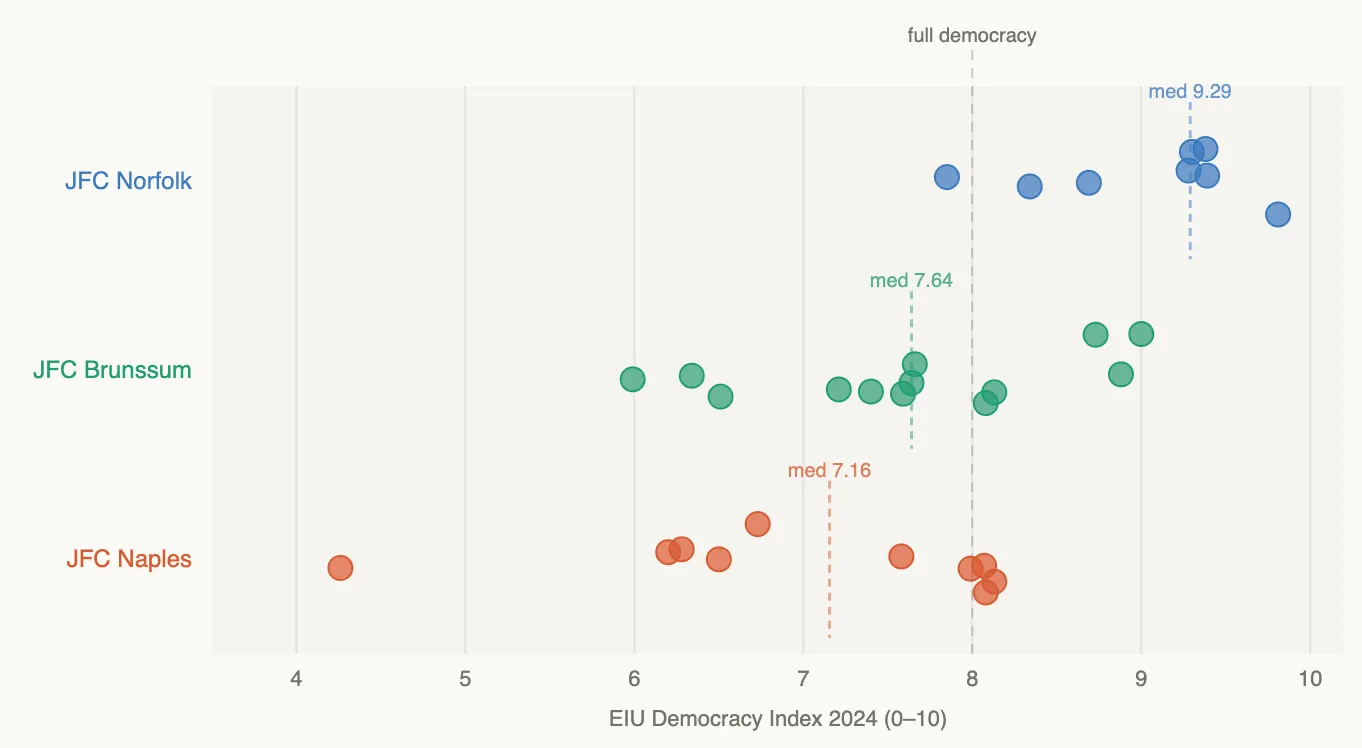 The three diffenet spheres within NATO, north, central and south, have a distincive spread in levels of democracy. Only JFC Norfolk is considered a full democracy, only the U.S. falling below that threshold, while Brunssum and Naples are on average considered flawed democracies. Interestingly, the U.S. is above the averages of both Brunssum and Naples.